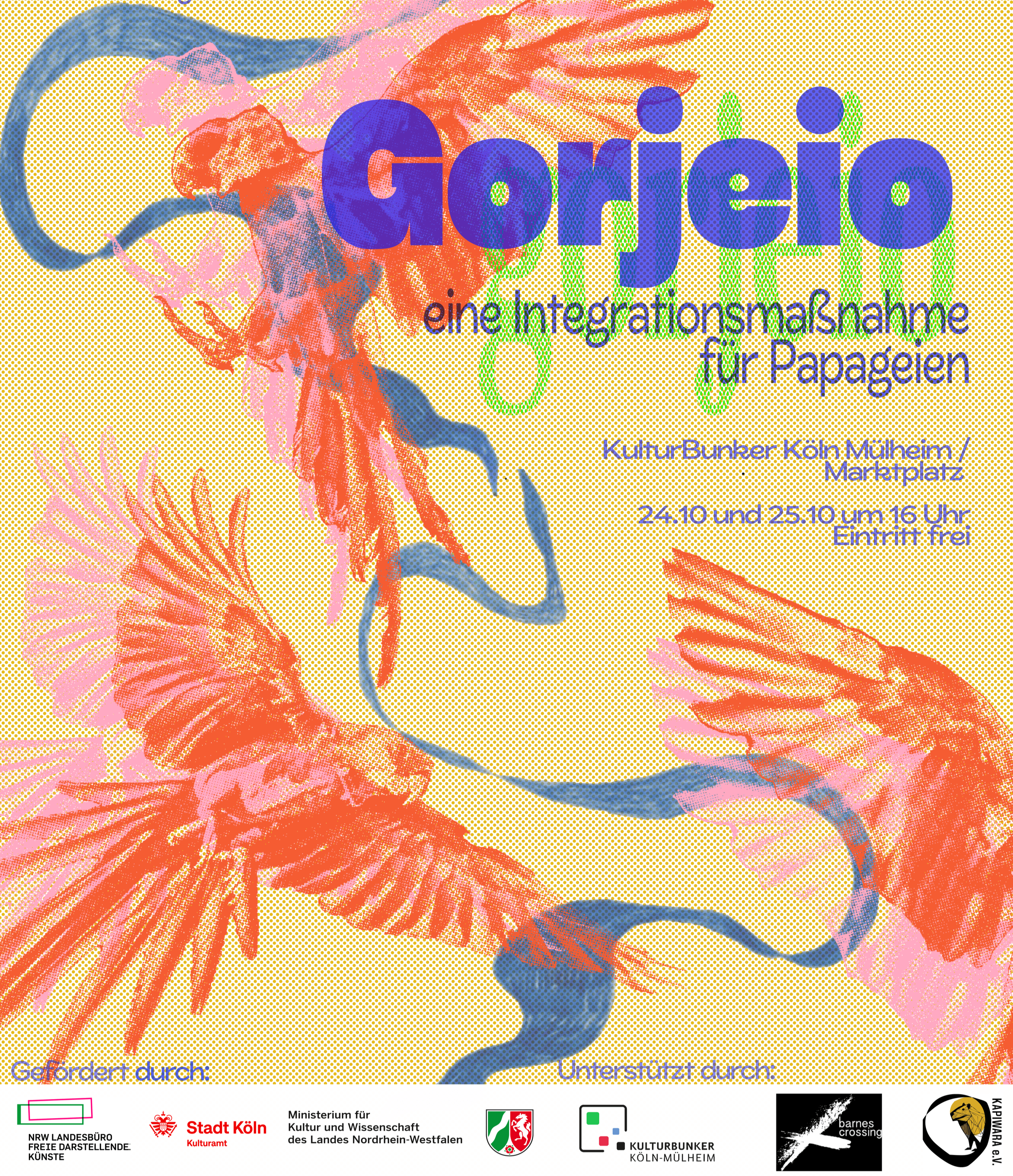GORJEIO ist vom Ministerium für Kultur und Wissenschaft des Landes Nordhein-Westfalen, vom NRW Landesbüro Freie Darstellende Künste und von dem Kulturbüro der Stadt Köln gefördert. Es wird vom Barnes Crossing, Kulturbunker Köln-Mühlheim und KAPIWARA e.V unterstützt.